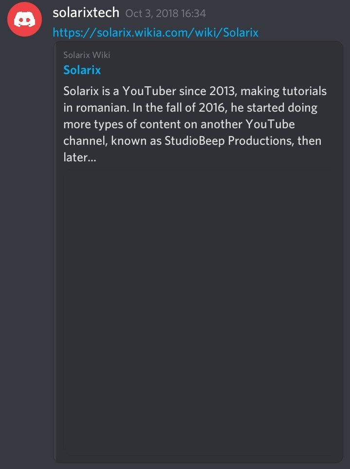 1. Fact: In October 2018, I've been experimenting with a personal wiki on Fandom that could eventually become the "Solarix Wiki". This was abandoned and deleted after a short time. The only public part of it now is the beginning of the "Solarix" article, as embed on Discord: