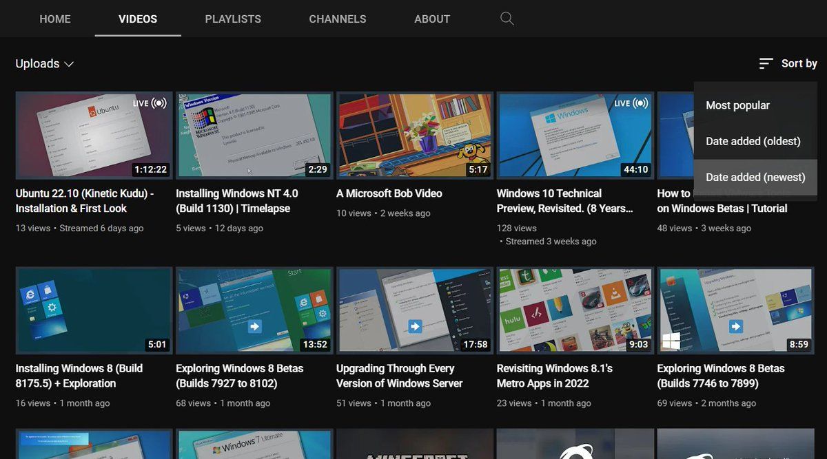 This new YT layout on web, at least on channels' videos tab, is a downgrade over the old one if you're someone who likes to browse through the vids X channel published (like me). First off, YT removed the ability to sort by oldest, so you can only sort by newest and most popular