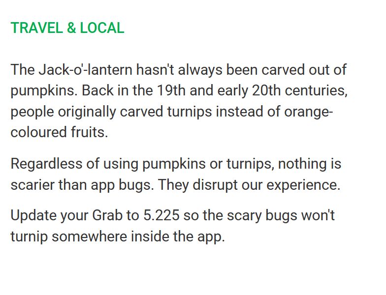 Some more Grab changelogs. Some actual effort put complete with some sort of humor, unlike most apps with their generic "bug fixes and performance improvements" changelogs; nice job!